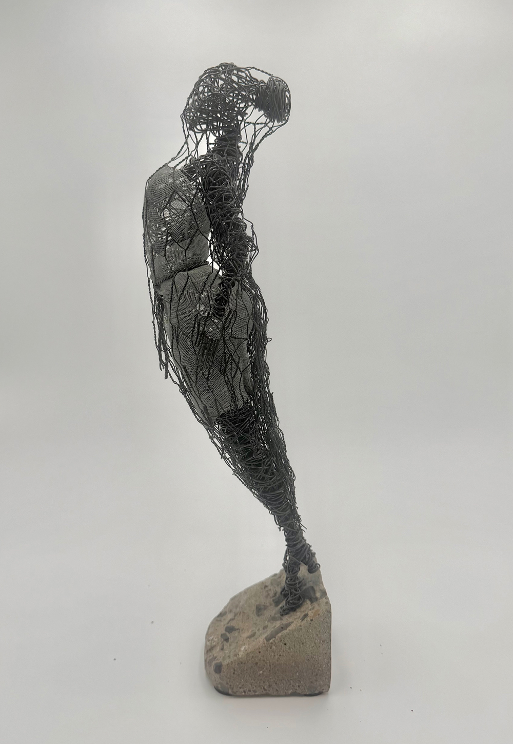 This wire sculpture by Armenian sculptor Karen explores the tension between strength and fragility within the human form. Created from intertwined black wire and mesh, the figure appears both solid and transparent, revealing the delicate structure beneath its surface.
