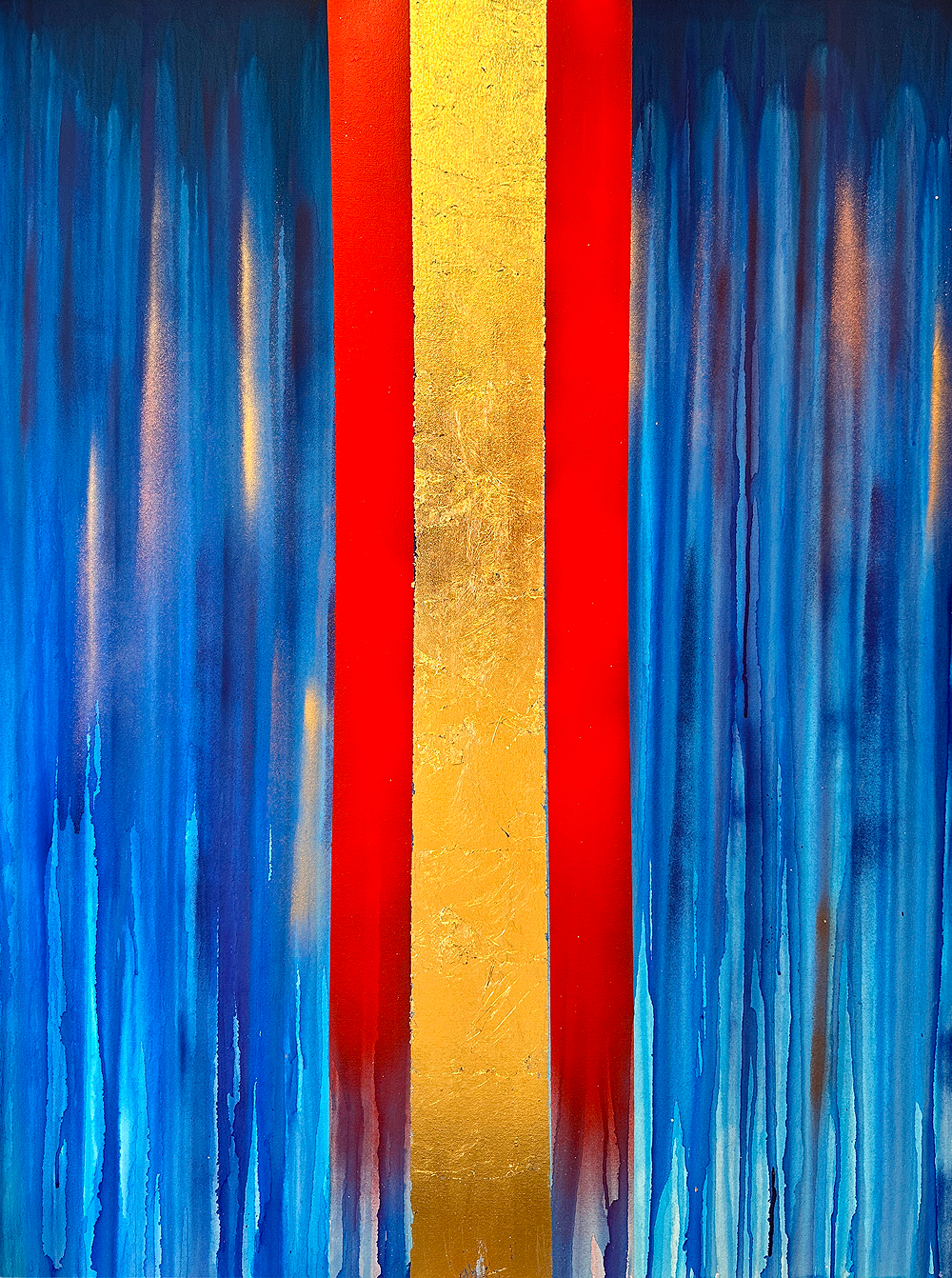 This artwork presents a dynamic interplay of color and texture, featuring deep blue hues contrasted with vibrant red and a shimmering gold vertical strip. The fluidity of the blue evokes movement, while the gold element adds elegance, enhancing the overall composition.