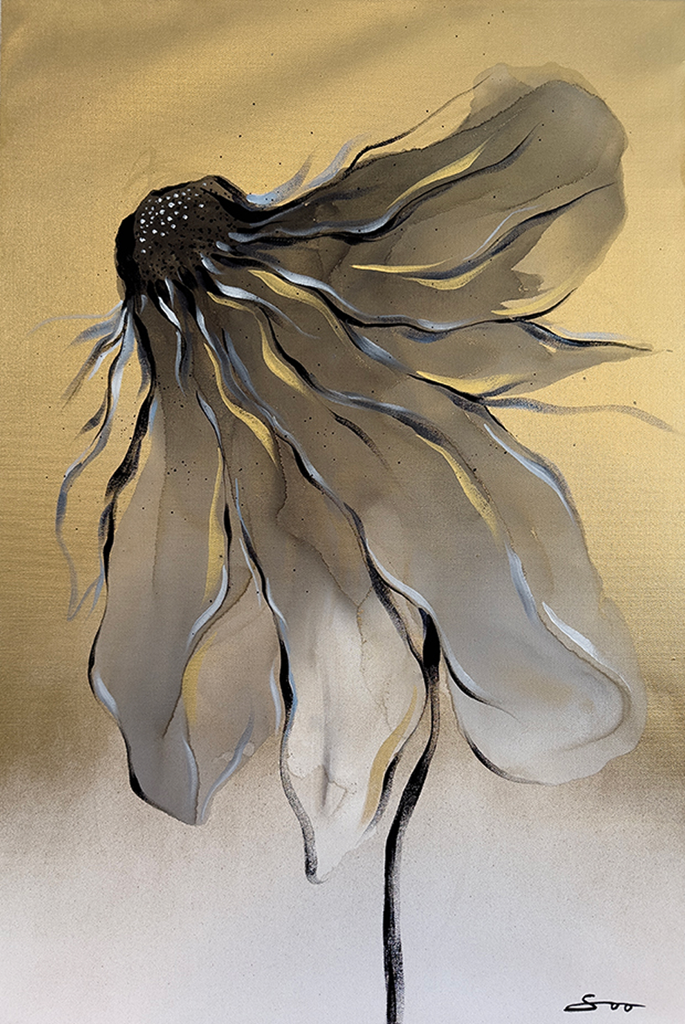 This artwork reflects the delicate beauty of life at every stage. A wilting flower rendered in golds and blacks emerges through transparent layers of ink and acrylic, capturing both fragility and elegance.